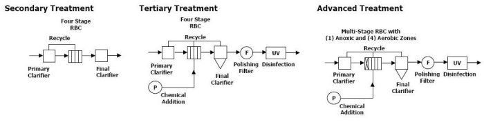 RBC facilities have primary clarification, aeration, final clarification and easily accommodate auxiliary equipment such as filtration, disinfection, chemical addition and minimal biosolids management. The treatment process can be designed for secondary, tertiary and advanced wastewater treatment.