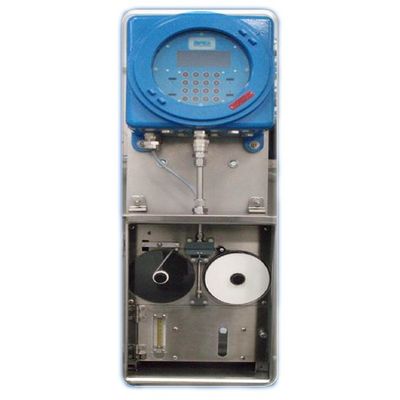 Measures H2S in natural gas, fuel gas, biogas or LPG. Duty: To measure the concentration of H2S in a process gas stream. The principle of operation is as follows. A reel of paper tape impregnated with lead acetate is exposed to the gaseous process sample in the sample chamber. Hydrogen sulphide (H2S) in the process sample reacts with the lead acetate, after acidification, to form lead sulphide (PbS), a brown compound that stains the tape. The higher the concentration of H2S the darker the stain. A focused LED and single photo detector system continuously measures the darkening stain and the analyser reports this as a 4-20mA output of the concentration of H2S.