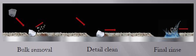 Ice is the only medium with three cleaning mechanisms (bulk removal, detail clean, and final rinse). You can decontaminate and clean in one step rather than two steps for traditional dry ice blasting.