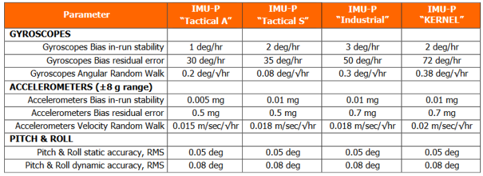 Fully calibrated, temperature compensated, mathematically aligned to an orthogonal coordinate system, IMU demonstrate less than 1 deg/hr gyroscopes and 0.005 mg accelerometers bias in- run stability with very low noise and high reliability.