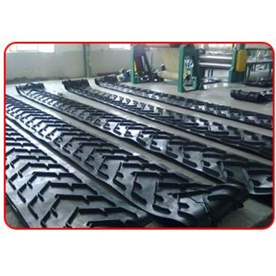 We in consistence technically design, manufacture, export Chevron Grade Conveyor Belts. Our Manufactured Chevron Rubber Cleated Conveyor Belts are "Factory Integrally Moulded". This means that an Un-cured Cleat Or Profile was cured itself in the Heavy Hydraulic Press with an Un-cured Virgin Green Belt Carcass, to form a One Piece "Integrally Molded Belt Construction”. We design, manufacture and supply various Conveyor Belt Widths with ‘V’ & ‘C’ Cleat Profiles with Carcass Base in C/C, N/N & E/P Fabrics. Dimension of Rubber Cleats Heights available are 12 mm to 25 mm, with brand names: ‘V- con/Bull flex’ Premium Quality. Chevron Conveyor Belts can be offered in Grades of: ‘M24, H R, S H R, U H R, F R & HYGIENIC {Food & Drugs Association} Approved Grades.