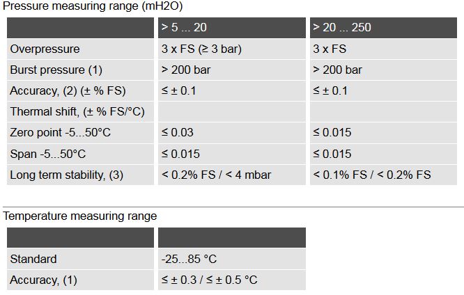 Pressure measuring range: 5…250 mH2O. Accuracy: ≤ ± 0.25 / 0.10 % FS. Temperature measuring range: -25…85 °C. Operating temperature: -5…50 °C. Process temperature: -5…50 °C. Interface: SDI-12 (V1.3). Materials: Stainless steel, Titanium. Feature: Recalibration possible, Adjustable units.