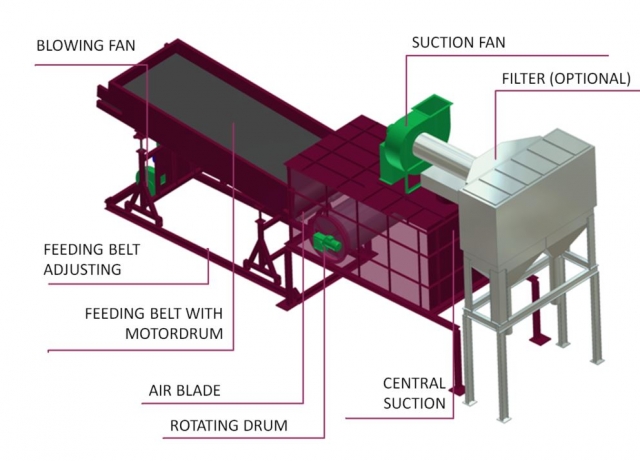The air separator Promeco PAS is renowned for its high efficiency in sorting light from heavy materials. Specifically designed to face the sorting of MSW and similar solid waste, commingled plastic waste or waste from selective collection, the Promeco PAS is designed to handle difference in specific weight of the materials to process and sort 2 fractions: Heavy (stones, glass, metal, wood, textile wet ...). Light (paper, film, plastics ...).