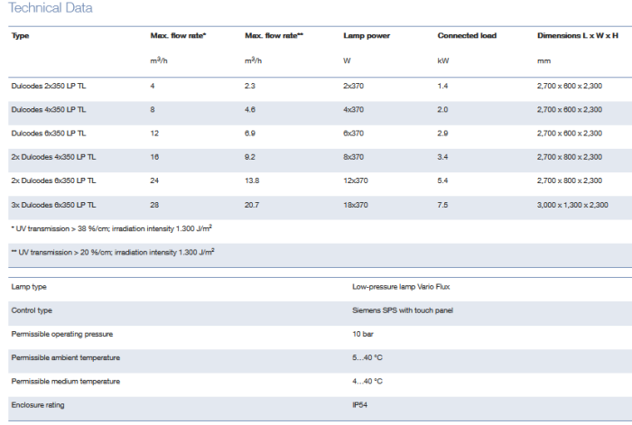 Flow up to 36 m3/h. The UV system DULCODES LP TL for syrup disinfection declares war on heat-resistant germs. In instances when standard heat pasteurisation isn`t up to the job, UV light provides a very quick and efficient form of disinfection without the need for heat.