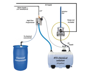 Our water driven chemical proportioning system will automatically refill a tank with ready-to-use chemical solution. When the solution in the tank drops below a pre-set level, the float valve triggers an air-activated solenoid to start the water flow. Using city water pressure, a venturi injection system draws and blends chemical concentrate into the water stream to create an accurately diluted solution. The system cycles continuously. Dual magnetic float valve design includes a primary valve to regulate normal operation and a secondary fail-safe valve to shut off the system if the primary float valve malfunctions.