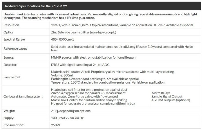 Normally portable FTIR equipment suffers from low resolution measurement. The atmosFIR FTIR allows however allows for resolution up to 0.7cm-1 (unapodized) allowing for detailed detection and speciation of gas species.