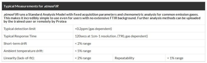 These advantages come with the benefit of improved performance over existing products, due to the new small, robust, high resolution interferometer with low noise measurement. atmosFIR is fitted with a sensitive DTGS detector, operating at ambient temperature without need for liquid nitrogen or other cooled detectors. Protea continues to offer our powerful PAS software suite, training and support, so that the user is able to achieve the best performance out of the product.