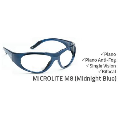 M8 style with integrated side shields, Anti-fog lenses available for non-Rx lenses, Accommodates SINGLE and BIFOCAL prescriptions (0 to +/-3.50), Fits small-large faces, Available color: Midnight Blue.