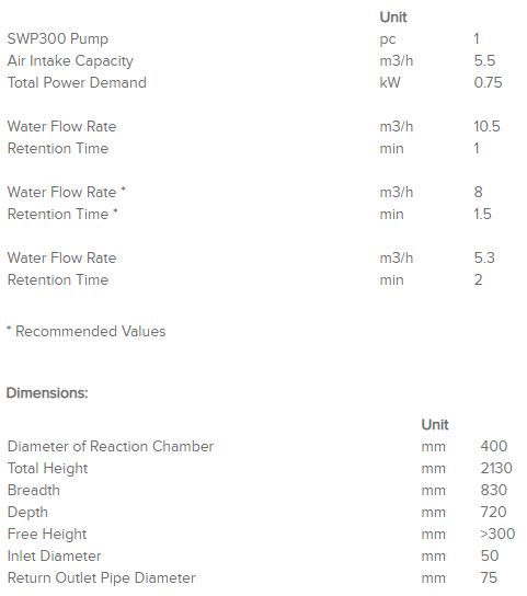 Skimz ST400 Commercial Protein Skimmer is fitted with 1 x SWP300 pump, drawing 5,500 litres per hour of air. Suitable for treating water volume up to 10,500 litres.