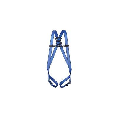 Realization. Webbings polyamide/polyester 45 mm. Buckles zinc plated steel. Threads polyester. Harness with dorsal anchorage point. Regulation for legs and shoulder straps.