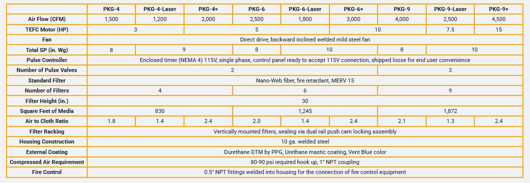 The economical Intercept PKG Series vertical cartridge dust collector can capture and remove most industrial process dust. A packaged dust collector with pre-selected integral fan assemblies commonly used in a variety of applications. A unique CAM-LOC cartridge locking mechanism securely seals the cartridge header plate to the tube sheet to prevent dust bypass. The PKG Series offers standard performance specifications that are suitable for many applications.