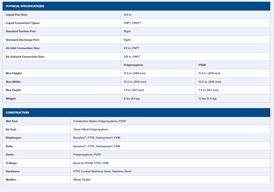Air Inlet : 1/4" FNPT. Liquid Inlet: 3/4". Liquid Discharge: 3/4". Connection Type: FNPT/FBSPT (Threaded). Max Suction Lift Capability: 15 ft-H2O (4.6 m-H2O) Dry, : 26 ft-H2O (7.9 m-H2O) Wet. Max Flow Rate: 17 gpm (64.6 lpm). Max Pressure: 120 psi (8.2 bar). Max Diameter Solids: 1/8" (3.2 mm). Displacement Per Stroke: 0.03 gal (0.10 L).