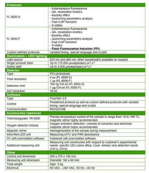 Double-Modulation Fluorometer FL 6000 measures chlorophyll α (Chlα)- -?uorescence. Measured ?uorescence emission is excited by a set of light- -emitting diodes that generate measuring ?ashes of few microseconds in duration and low intensity; the photochemistry is driven by single-turnover ?ashes or by continuous actinic irradiance. Chlorophyll ?uorescence is detected by a PIN photodiode and digitized by a 16-bit A/D converter. The instrument supports Pulse Amplitude Modulation measurements and, at the same time, can capture fast OJIP transients or perform rapid measurements of QA- reoxidation kinetics, S-states.