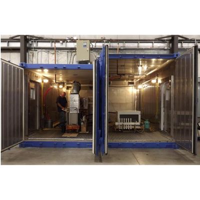 The 2880 cubic foot facility tests temperatures between 0°F and 120°F (-17°C and 48°C). Humidity is created by an ionic-bed electric steam generator rated at 45 pounds/hour (20.4 kg/hr), controlling to ±2.5% relative humidity. Cooling capacity is up to 33,000 BTUH (9.67 kW) per room, while heating capacity varies from 14,000 BTUH (4.34 kW) in the indoor room and 130,000 BTUH (38 kW) in the outdoor room. Each room operates 2100 CFM (3567 cubic meters/hr) of continuously re-circulating air. Airflow measurements (up to 800 CFM) and unit-under-test leaving air properties for dry bulb/wet bulb are collected via a code tester or standard airflow hood. Automated data acquisition and control reduces data collection time.