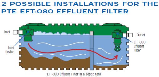 - The PTE Effluent Filter is generally installed inside the second chamber outlet of the septic tank (concrete or plastic), but can also be installed in a PTE TLF-240 Filter Container immediately downstream from the tank