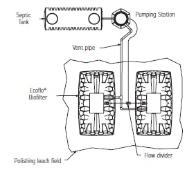- Gravity outlets are connected to 100 mm (4") PVC pipes that are connected directly to Ecoflo® Biofllters or any soil absorption system.