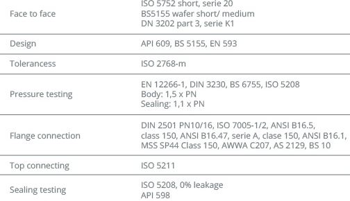 Materials: Body: WCB, CF-8M, CF-8, CF-3M. Disc: CF-8M, CF-8. Shaft: AISI 316, AISI 304, 17-4PH. Seat/ sealing: PTFE, PTFE+15% glass., PTFE+15% graphite. Retainer: AISI 316. Packing: Graphite, PTFE, PTFE+15% Graphite. Other materials available on request.