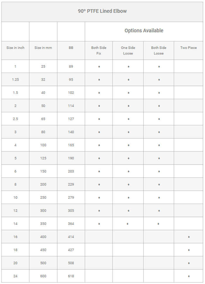 PTFE Lined Elbow 1” (25 NB) TO 24” (600 NB). PTFE lined elbows are a type of pipe fitting commonly used in chemical processing and other industries where corrosion resistance is a key requirement. They are manufactured by companies such as Asset Fluoro Systems and consist of an elbow shape made from a metal material, such as carbon steel, with a lining of PTFE (polytetrafluoroethylene) on the inside. This PTFE lining provides excellent chemical resistance and temperature tolerance, making the elbow suitable for use in highly corrosive environments. PTFE lined elbows can also be used in applications where high pressure, vacuum or thermal cycling is present. They are typically used to connect two pipes at a 90-degree angle and are available in a variety of sizes to accommodate different pipe diameters. Overall, PTFE lined elbows are a reliable and cost-effective solution for industries that require corrosion resistance and high durability.