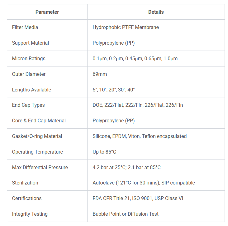 Micron ratings from 0.1μm to 1.0μm provide reliable and consistent retention.