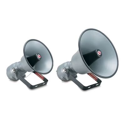 Federal Signal’s Models AM300X and AM302X are transformer coupled, re-entrant speakers for use in public address or paging applications. These speakers feature rugged cones and projectors constructed of spun aluminum. The speaker wiring connections are enclosed in a dust- and moisture-proof, die-cast aluminum compartment. All external surfaces are sealed with a red or gray powder coat paint. Model AM300X is 15 watt and the AM302X is 30 watt. The unique shape of the speaker projectors provides a 60° sound dispersion. The entire speaker can be swiveled 180° in order to direct sound effectively. Models AM300X and AM302X can be used with supervised alarm notification systems or the AudioMaster® amplifiers with the AudioRouter™ to complete an industrial grade public address system.