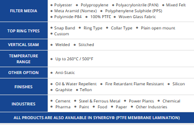 Pulse Jet bags are cylindrical bags hanging vertically in a pulse jet dust collector bag house. The dust collects on the outer surface which is also called dust cake and is cleaned by a high velocity pulse of gas which is released in regular interval In order for gas to sustain the regular operation of Filtering and cleaning it`s very important to select the right fabric media and design to achieve maximum efficiency. We offer PuSejet bag; in all major fabrics used industry wide making sure it`s