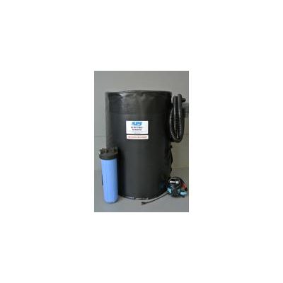 The blue plastic filter case, a sump pump with a heating ring and a Pump-Thru-Barrier™ covered with a custom sized heating blanket.