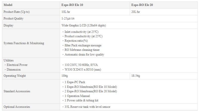 Expe Series are the only products in Korea, which are being exported with verified water quality, its superior functions and international sense of design competing with world renowned makers. Produces the ASTM water grade III, IV Wide graphic LCD display Easy to use and convenient maintenance Compact design Printer for data output ISO9001 and certified CE.