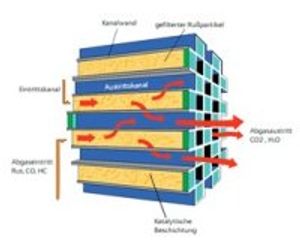 The filtration is achieved by a wall-flow method where the channels are plugged on one end and particles are remaining in the wall while the gas flows through the walls. A huge number of channels result in a big filter surface with a high storage capacity for soot particle.
