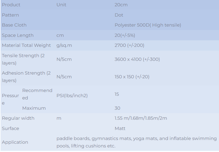 The double wall fabric is mainly used in outdoor leisure and sports fields such as paddle boards, gymnastics mats, yoga mats, and inflatable swimming pools, lifting cushions etc.