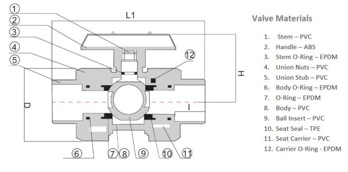 Now available in 1/2” –4” size. Durable gray PVC construction. EPDM O-rings / PTFE seat seal. Removable union ends. Molded ABS handle w/ valve open key. Socket (ANSI) & threaded (NPT) ends included (1/2” –2”).