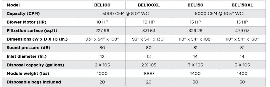 The BEL Series enclosureless dust collector is an industrial small capacity system generating up to 5000CFM, available in single or three phases electrical connection. This dust collector is designed to collect dust particles ranging from coarse to mixed sizes, generated by wood machines operating in intermittent or continuous fashions and producing moderate to heavy dust loads. The BEL Series is generally recommended for applications involving one or two machines in a small shop environment or in larger facilities where there is a need for an industrial “stand alone solution”.