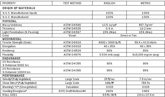 - Maximum permissible velocity and shear stress has been obtained through vegetated testing programs featuring specific soil types, vegetation classes, flow conditions, and failure criteria. These conditions may not be relevant to every project nor are they replicated by other manufacturers. Please contact Propex for further information.