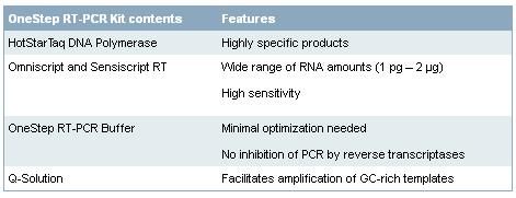 The QIAGEN OneStep RT-PCR Kit allows fast and easy RT-PCR setup. Whatever your application — virus detection, molecular diagnostics research, or gene expression — just mix all components together in one tube and start your thermal-cycler program . The reaction mixture contains all of the reagents required for both reverse transcription and PCR; nothing needs to be added once the reaction has been started.