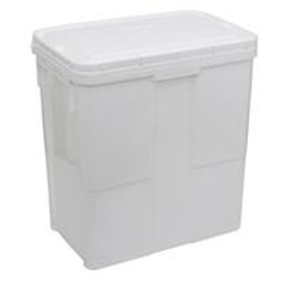 Shape: Rectangular, conical (tapered). Dimensions (mm, L x W x H): 598 x 397 x 635. Volume (L) under lid: 112.1. Closure type: Press lid with TE tear-off band. Raw material(s): HDPE base and lid. Tamper Evidence: Yes, integral. Handles: Integral side grips. UN code: 4H2/Y50/S.