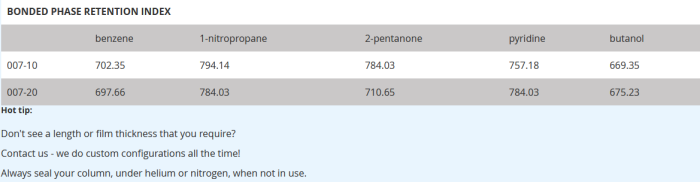 007-10 Phenyl Methylpolysiloxane columns are available in all standard column I.D.`s and column lengths.