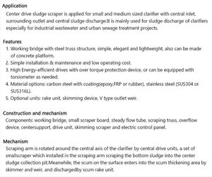 Centre drive sludge scraper is applied for small and medium sized circular clarifier with central inlet, surrounding outlet and central sludge dischrage.It's mainly used for sludge discharge of clarifiers especially for industrial wastewater and urban sewage treatment projects . Pls email grace.xia@jorsun.com.cn or call 0086 13163329251 for more info .