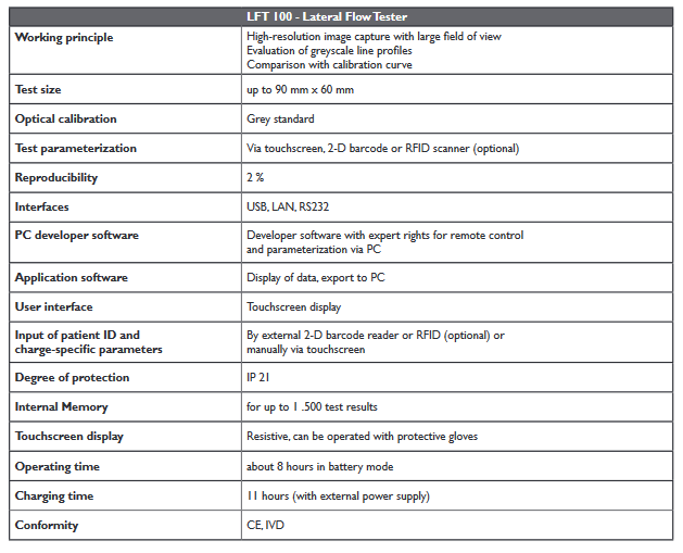 From idea to series - The LFT 100 is a standalone instrument for quantitative analysis of predefined lateral-flow tests at the point of care. New tests can easily be added by setting the calibration parameters through the development software. In addition, the LFT 100 is ready to analyze a large variety of tests with high accuracy.