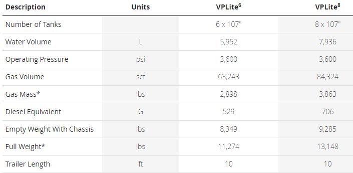 - The total capacity of the VPLite6 system is 62,726 SCF at 3,600psi and the total capacity of the VPLite8 system is 83,635 SCF.
