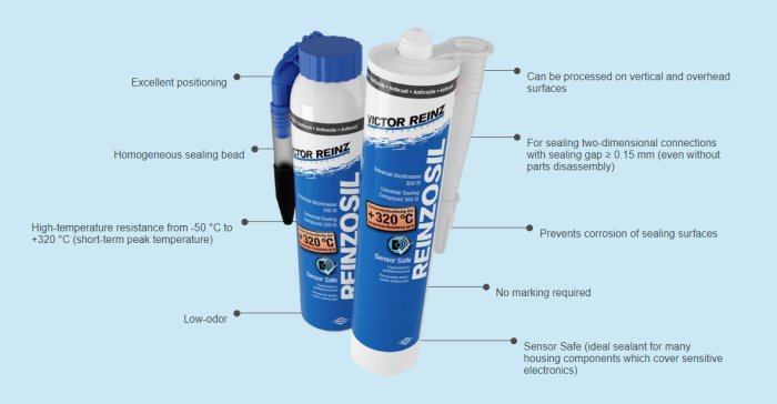 REINZOSIL is especially ideal for sealing surfaces in engines, transmission, axles, cylinder liners and plastic housings; It is very suitable for rough sealing surfaces and can be used universally for all motor and vehicle makes. REINZOSIL is resistant to gasoline and diesel fuels, biodiesel, oils, greases, lubricants, water, seawater, sunlight and ozone. There is no outgassing, i.e. no gas escapes from REINZOSIL highly elastic universal sealing compound under the effects of temperature, so it does not influence electronic sensors.