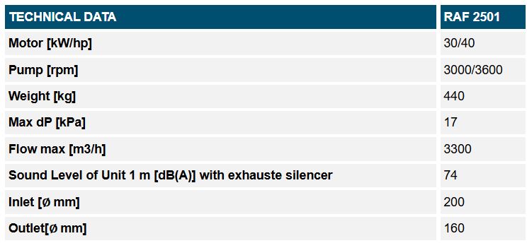 The RAF 2501 is applied in extraction systems requiring large air flows for lighter types of dust and cleaning. Pressure generation is achieved through two series connected stages.