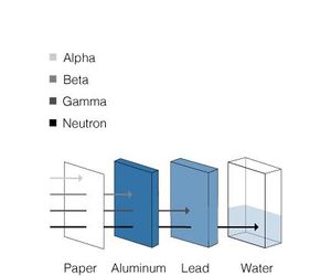 Radioactive sources typically emit alpha, beta, gamma and/or neutron radiation. The graphic on the right shows the penetration capability of each radiation type through different shielding materials. While alpha radiation is stopped by a piece of paper, gamma and neutron radiation are more penetrating and are thus the radiation of choice for standoff detection.