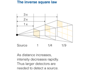 The further away the measurement instrument is from a source, the smaller the probability of radiation detection. And it is not linear. At three times the distance from a source, the probability of detection with the same device is not three times lower but around nine times (see figure on the right). For example if 90 gammas from a radioactive source go through a given detector area at 1 m distance, only 10 gammas from the same source arrive at the same detector area positioned at a distance of 3 m. Thus, to get a reasonable sensitivity, large area detectors are needed for standoff detection.