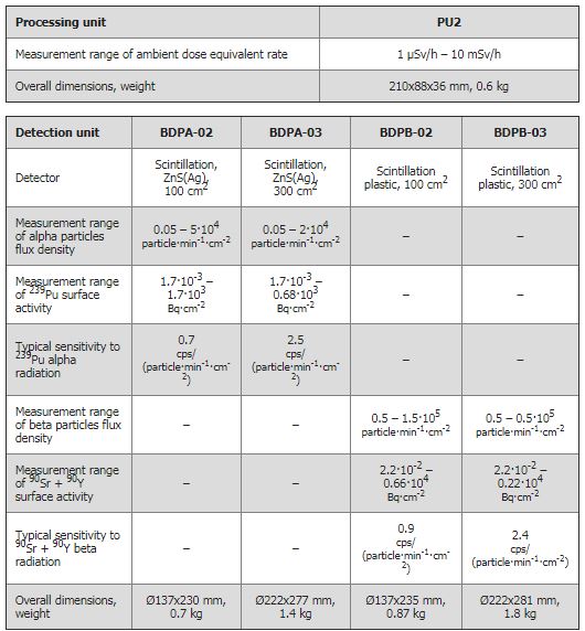 This configuration of radiation monitor can be used for the following purposes: Measure alpha particles flux density and surface activity of 239Pu with BDPA-02 / BDPA-03. Measure beta particles flux density and surface activity of 90Sr+90Y with BDPB-02 / BDPB-03. High sensitivity: Sound, light and visual alarm for exceeded threshold levels. Can be operated both as fixed and portable instrument. Wide measurement range.