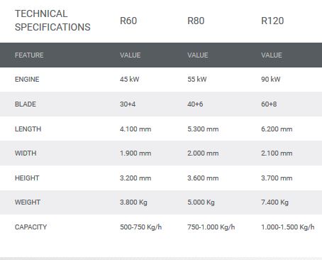 Sweden “SKF” brand heat-resistant bearings were used and Sweden steel are used for special process and hardness steel tool blades. All electrical / electronic equipments are “SIEMENS and SCHNEIDER”, hydraulic system is “BOSCH REXROTH”. According to product capacities R60, R80 and R120 are three models. CE and EAC certificates are available.