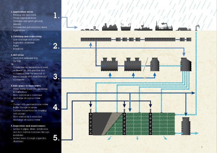 The Raineo system is designed for underground application. It functions under various circumstances and for diverged objectives. Because Raineo is buried underground there will be no disfiguring elements to be seen. This is important regarding the vast array of situations where the system can be implemented: