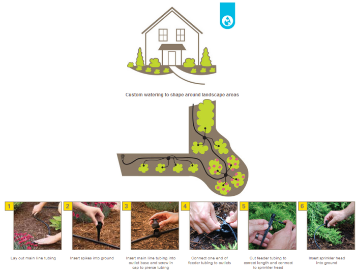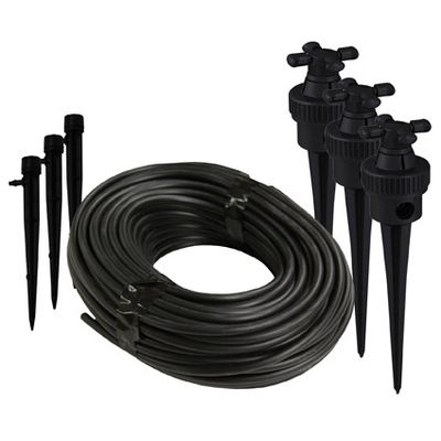 Designed to water shrubs and landscapes efficiently. Includes 50 feet of 1/2” tubing, 3 spike manifolds with 4 outlets each, 50 feet of 1/4” “cut to fit” tubing. 12 adjustable-volume low-flow sprinkler heads. 5 metal tubing hold-down spikes. 8 goof plugs. Water is distributed at ground level to minimize run-off. Easy set-up with maximum flexibility. Set up in 20 minutes or less.