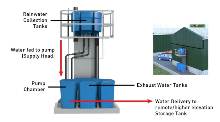 The Hydromentum is a rainwater harvesting system which collects the water and then uses the Papa ram pump to deliver it to storage tanks and consequently used later in applications where the public supply can be replaced.