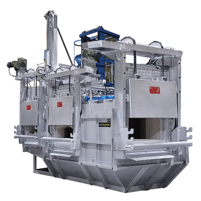 Our GM-K Series gas ramp melting furnace, also known as a combi melting furnace, or a multi-chamber furnace, or sometimes called a dual-chamber furnace, is extremely flexible. The furnace has two distinct functions. On the ramp side, you can pre-heat and melt sows, T-bars, or ingots, and on the shaft melter side, you can melt returns, ingots, even scrap, or a combination of any of these. This furnace offers excellent efficiency, uniform melting, and operator safety. With a large melting and holding capacity, this furnace is the ultimate choice for large volume, central melting. This series has an automatic elevator for simplified charging. And like all our furnaces, the GM-K Series is controlled by a PLC and a color HMI touch screen which runs a sophisticated program that optimizes performance, operation, and efficiency.