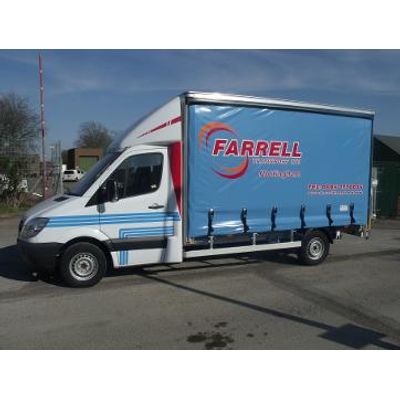 Aluminium curtain side body complete with 500 k column tail lift mounted to Mercedes Sprinter chassis. 29 ft curtain side body.