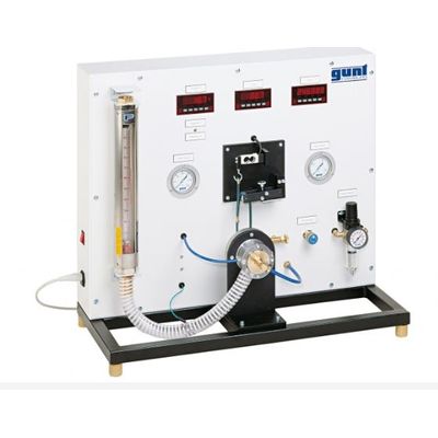The inlet and outlet pressure at the turbine are indicated on manometers. The turbine torque is determined by measuring the force on the band brake. The speed is measured with an optical speed sensor. Torque, speed and temperatures are digitally displayed. The air flow rate is measured with a rotameter and set by means of a valve.